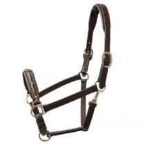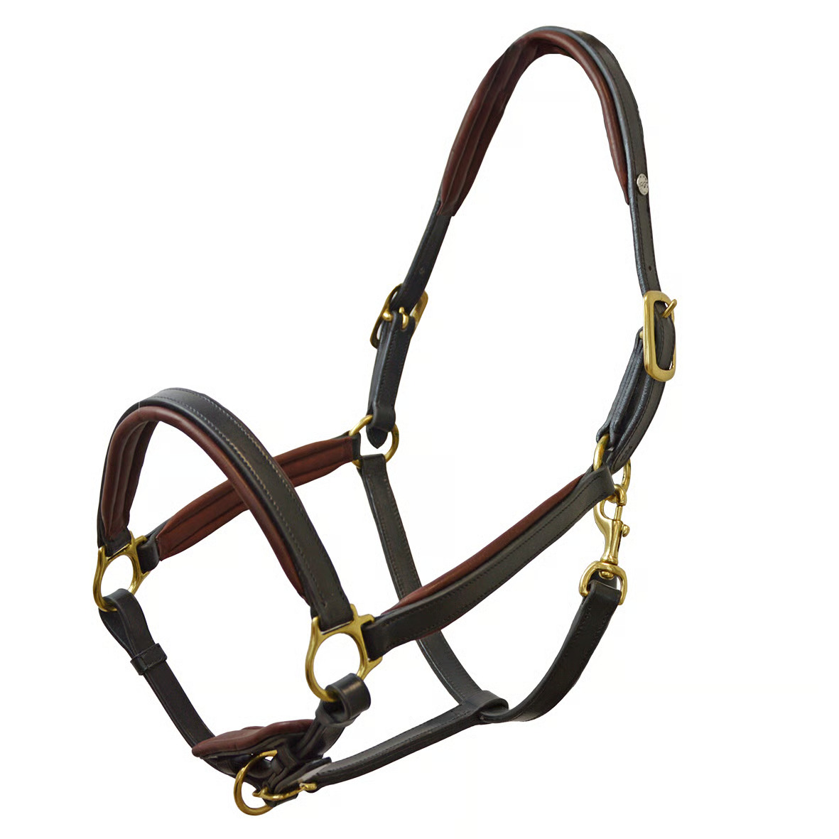 Cavezza imbottita Winner, in cuoio, con doppia fibbia in ottone e moschettone girevole. Di colore nero con imbottitura interna nocciola.