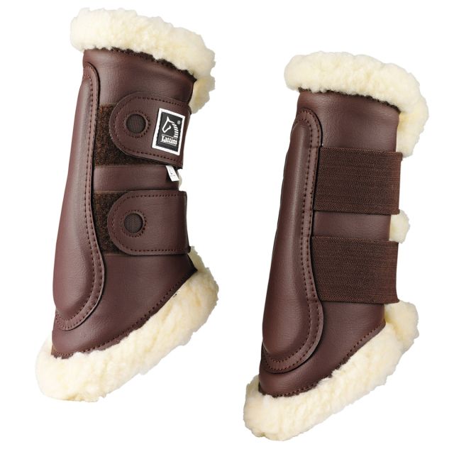 Stinchiere imbottite con agnello sintetico. Chiusura con due cinturini con strappo ed elastico.
